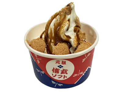 小野ファームさんの生乳100%ソフトクリームに、黒蜜・黄な粉をかけ、もちもちの信玄餅をトッピングして仕上げました!