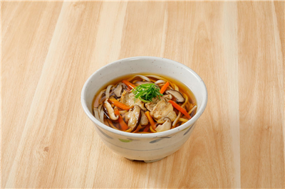 鶏だしのそばつゆ、具材は鶏肉やにんじん、しいたけなどを入れるのが特徴です。 -