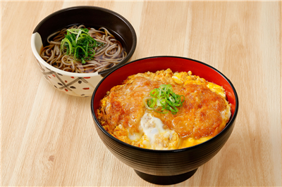 ロースかつは三元豚を使用。半そばは、冷たいおそばにも変更できます。