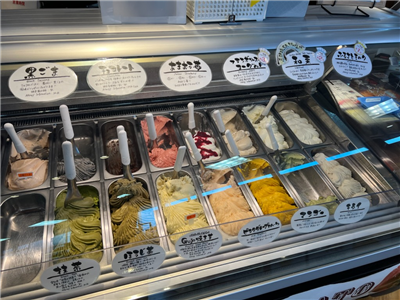 郡上市に本店を構える「明宝ジェラート」を恵那峡SA下り線でお召し上がりいただけます。ショーケースにはまるでケーキみたいなカラフルで色んなフレーバーが並んでいます。すべてのジェラートのベースに、ミルク系は飛騨牛乳、シャーベット系は郡上の自然が生んだおいしいお水を使用しています。