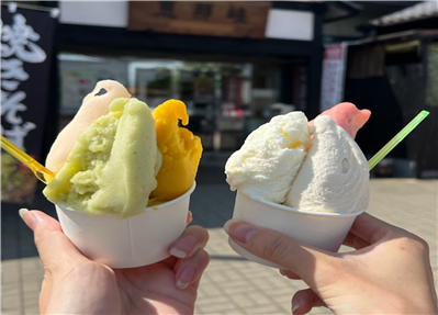 第3回ハイウェイぐるめまちなか大集合で準グランプリを獲得した「明宝ジェラート」は、常時13種類のフレーバーをご用意しております。栗を一粒丸ごと包んだ恵那峡SA名物「栗あわせ」もどうぞ♪
