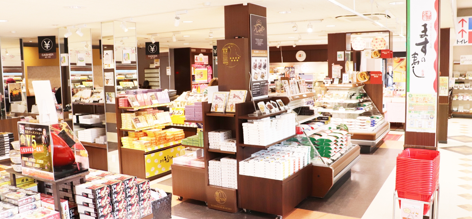 富山湾に面した富山県の豊かな食、特産品、名物品に加え、恋人の聖地オリジナル商品など旅を楽しくさせるアイテムが揃っています。さらに、手作りの「ますの寿し」などここだけの限定商品にも力を入れ、さまざまなお客様のニーズに応えられる品揃えが自慢です。 |
